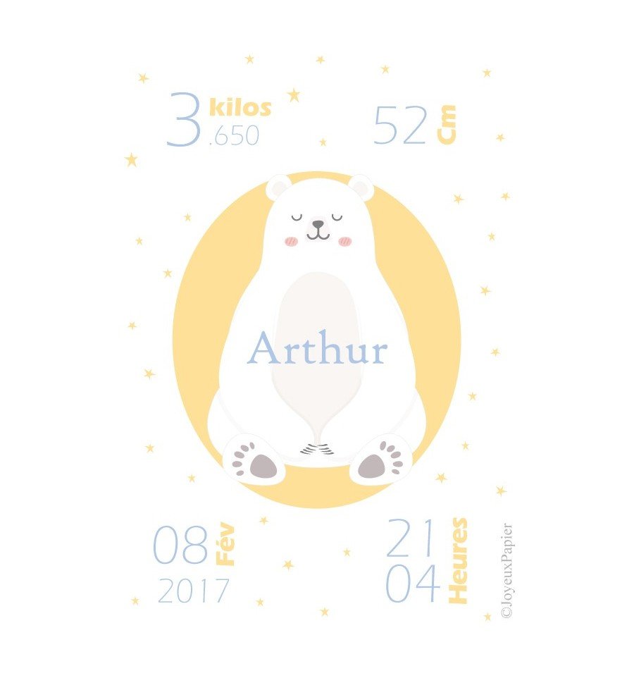 Spécial naissance, très belle affiche personnalisée pour petit garçon modèle ours polaire. Thème aux couleurs tout douces reprenant les infos du premier jour du bébé : date, heure, taille et poids. (Cadre non inclus)